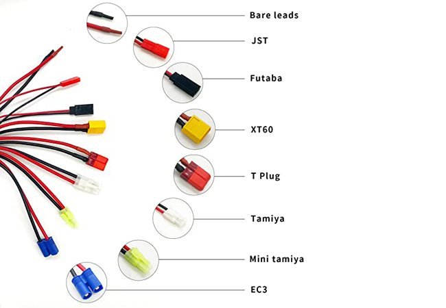 RCケーブルは、EC3オスプラグ、タミヤスタイルオスプラグ、TRXスタイルオスプラグ、XT60オスプラグ、JSTメスプラグ、ディーン-Tオスプラグ、Futabaスタイルメスプラグ、DIY裸線などの出力プラグに対応しています。入力プラグは4mm金メッキバナナプラグです。